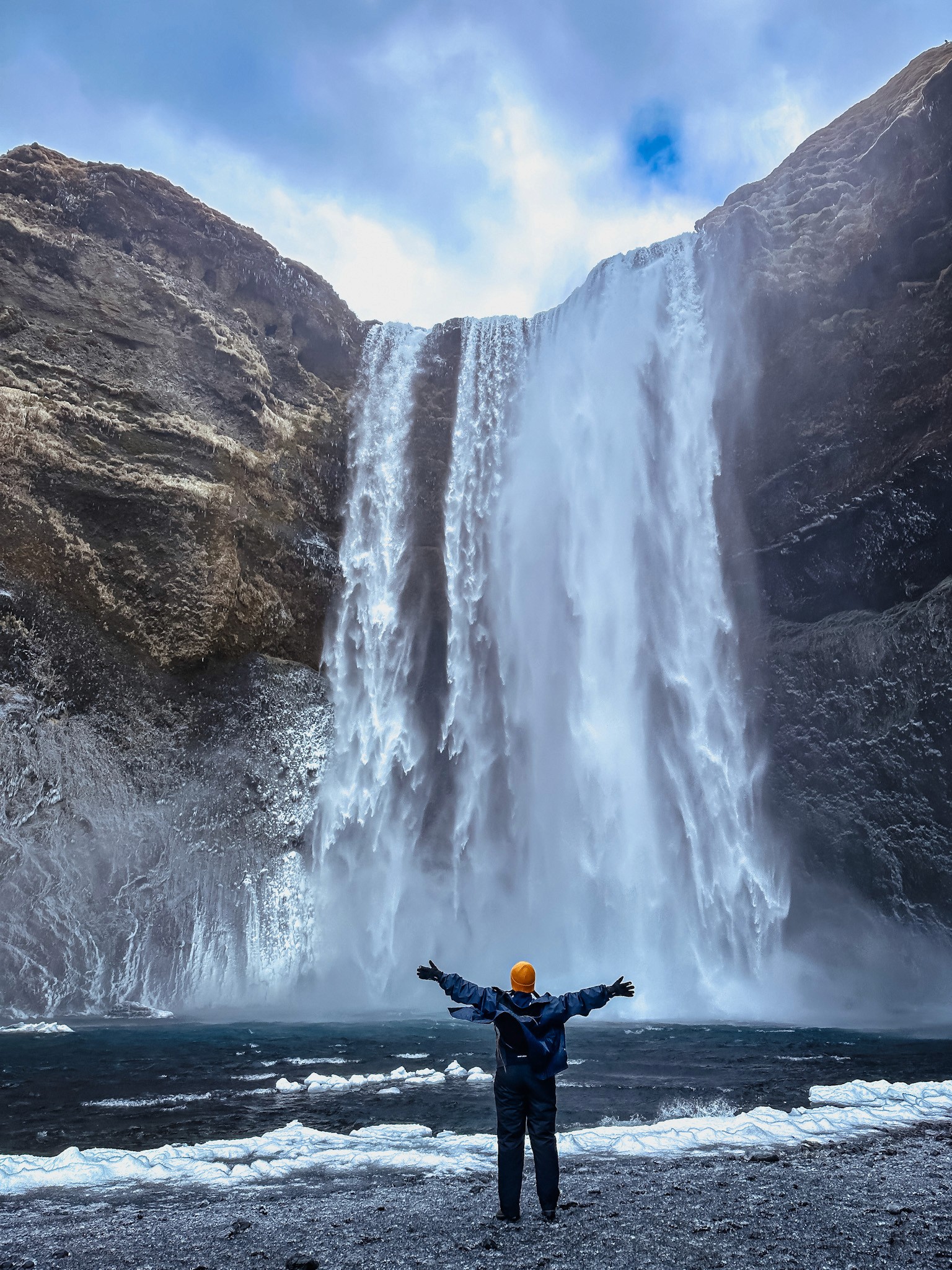 On the drive to the glacier, we stopped at Skógafoss one of Iceland’s most iconic waterfalls and a filming location for Game of Thrones. The waterfall drops 60 meters and you can walk right up to the base. On a clear day, you’ll see a rainbow in the mist.